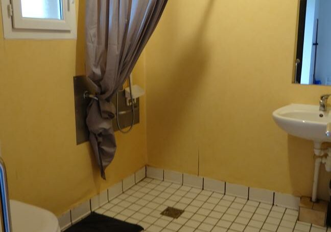 Une salle d’eau avec douche à l’italienne, WC et lavabo accessibles pour un confort optimal. chaise ou tabouret de douche à votre disposition sur demande.