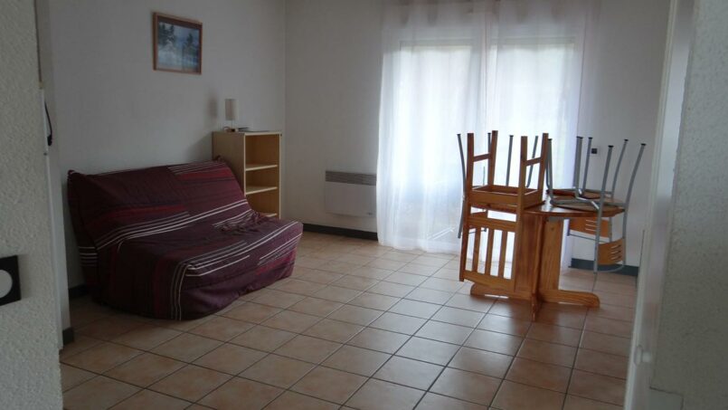 La grande pièce lumineuse comprend une kitchenette entièrement équipée (frigo table-top, micro-ondes, four, bouilloire, cafetière Senséo, vaisselle…) avec des rangements, une espace repas et un canapé lit.