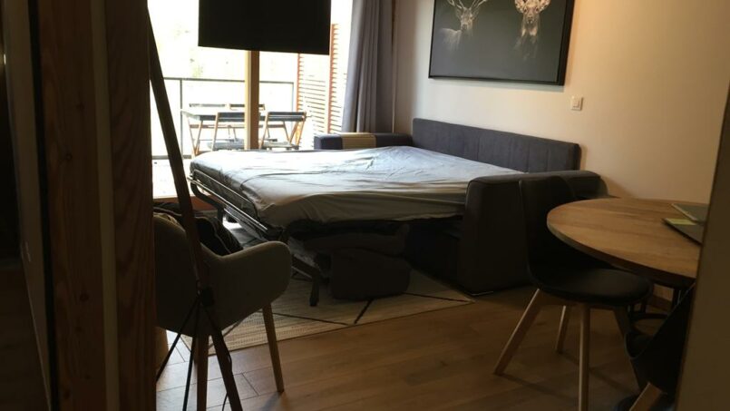 Le salon ouvert sur la cuisine dispose d’un système de canapé convertible en lit double (160×195) pour accueillir deux personnes. La cuisine de taille modeste est entièrement équipée. Le balcon offre une vue imprenable sur la montagne, parfait pour se détendre après une journée d’activités.