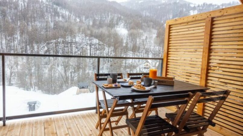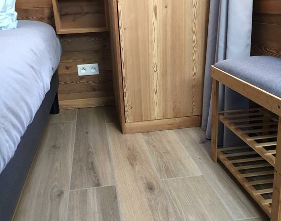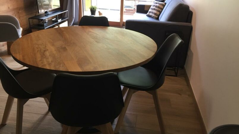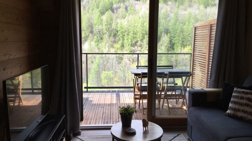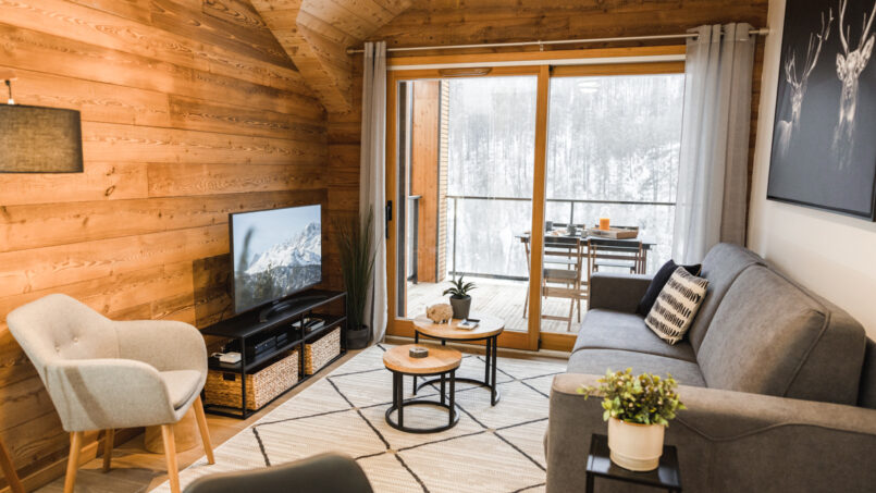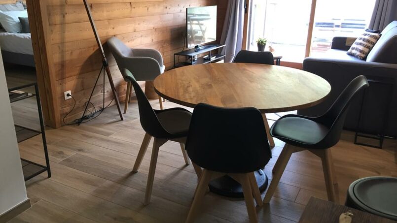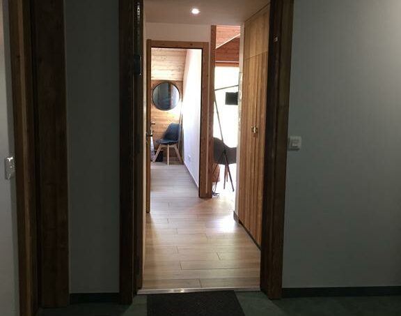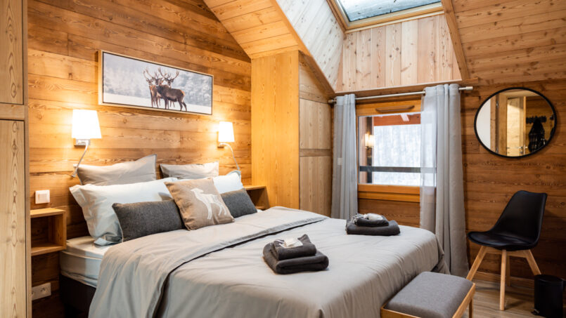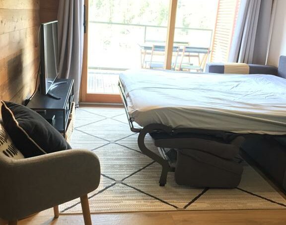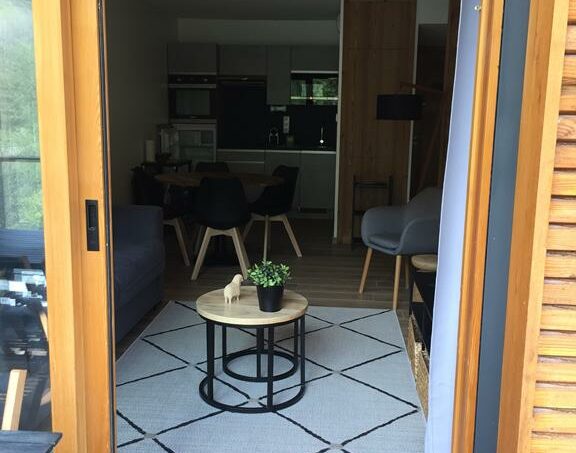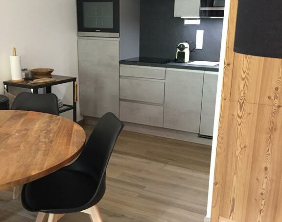 Appartement chaleureux et cosy, avec une décoration de style montagnard, des plafonds voûtés en bois dans le salon et un puits de lumière dans la chambre pour dormir à la belle étoile. Il fait 40m2 et est situé au 2ème étage avec un grand ascenseur (immeuble de 2022), et peut accueillir jusqu’à 4 personnes.
