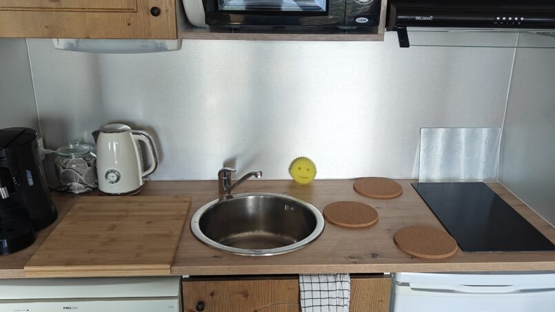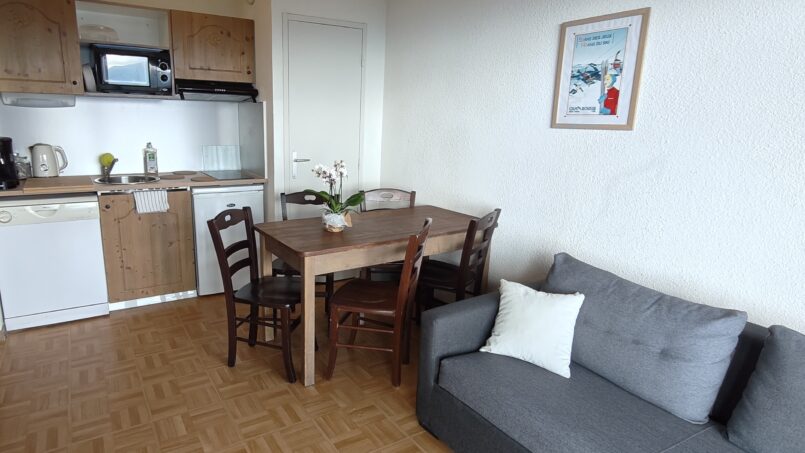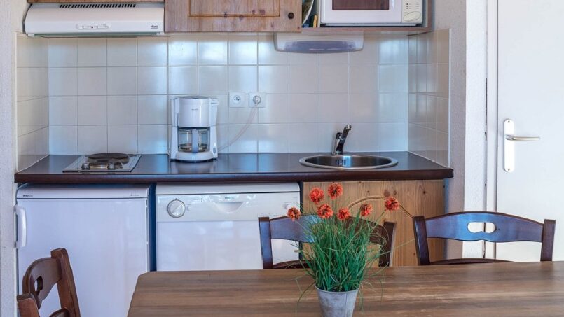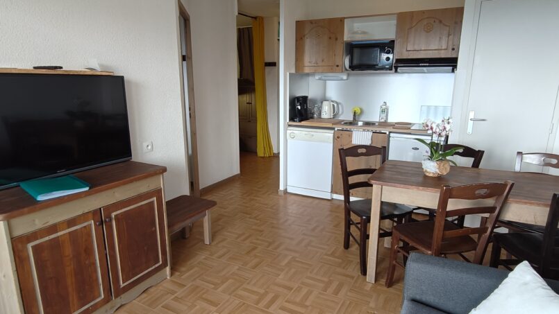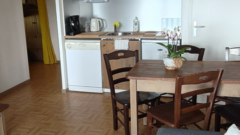 Le hall s’ ouvre ensuite s’ ouvre sur la pièce de vie, salon/cuisine rénovée avec plaque vitrocéramique, frigo, lave-vaisselle, bouilloire, machine à café (Senséo) et dosettes à disposition. Le salon est meublé d’ un canapé confortable et convertible, et d’ une grande TV. Sous-celle-ci, quelques jeux de société pour tous les ages.