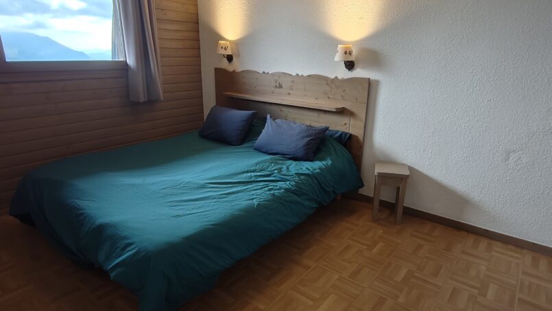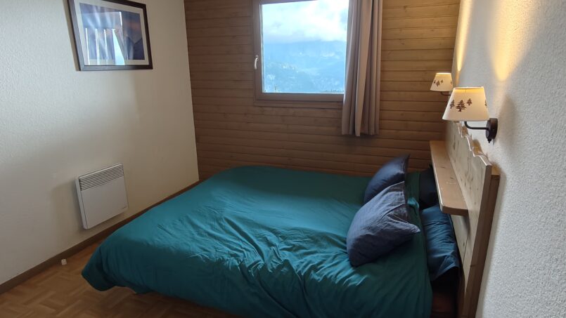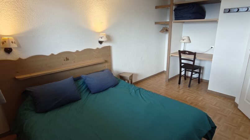 A droite du salon, une chambre spacieuse à lit jumeau (pouvant être rapprochés pour former 1 grand lit double), bureau, et rangements pour un repos optimal entre deux journées d’activités.