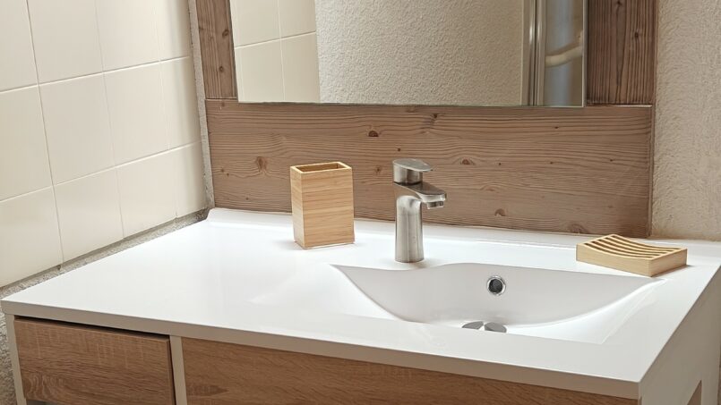 A gauche, la salle de bains avec lavabo adapté PMR, et douche 85×85 à accès facile grâce au seuil bas et aux deux parois de douches pivotantes.