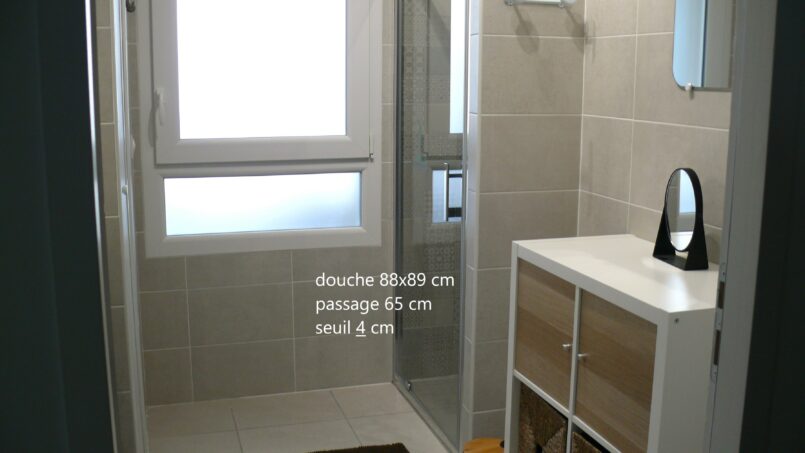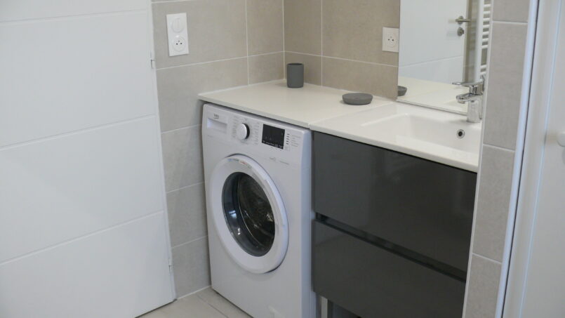-la salle de bain avec fenêtre comprend une douche de 90×90, un lavabo, une armoire de rangement et la machine à laver.