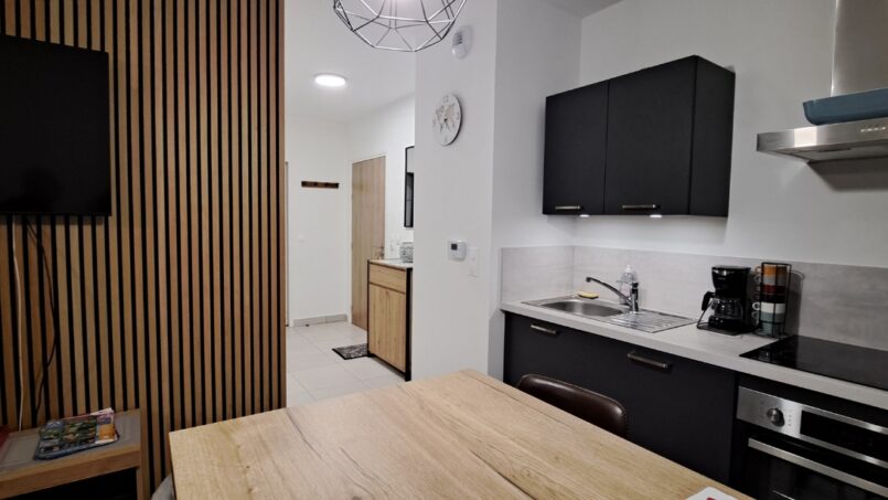 -une cuisine équipée avec four, micro-ondes, lave-vaisselle, réfrigérateur congélateur et plaque vitro cérame.