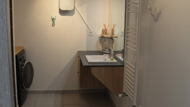 – Meuble vasque équipés PMR (évidé sous le lavabo pour passage fauteuil roulant) avec rangements