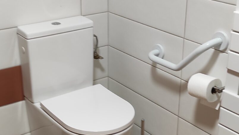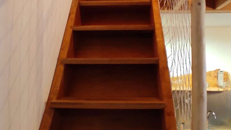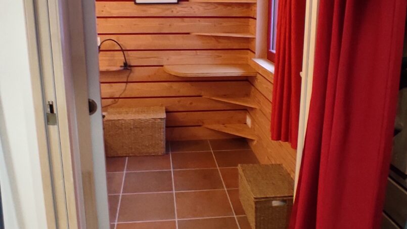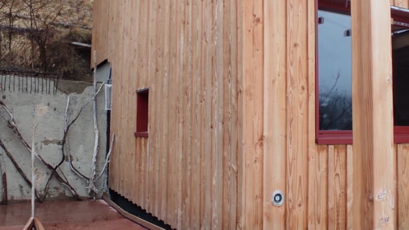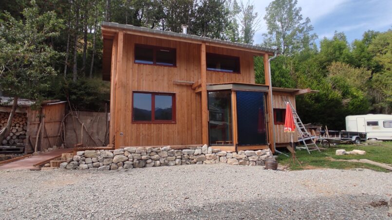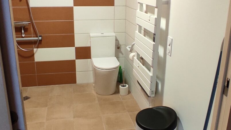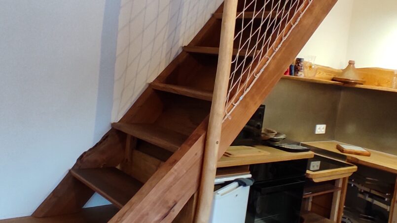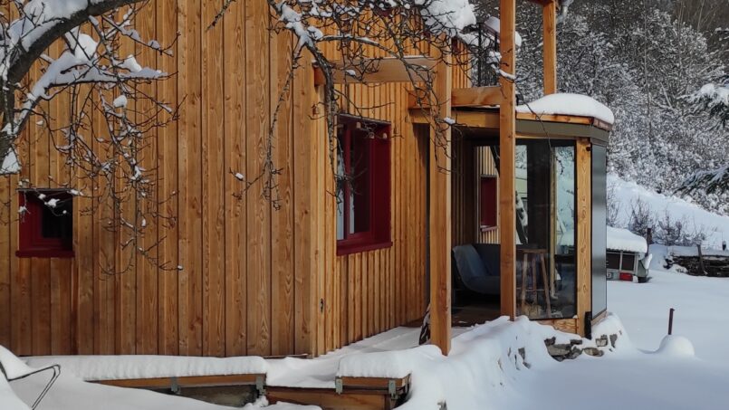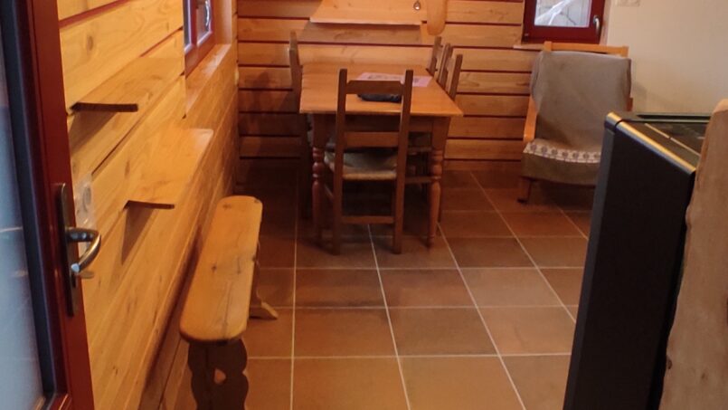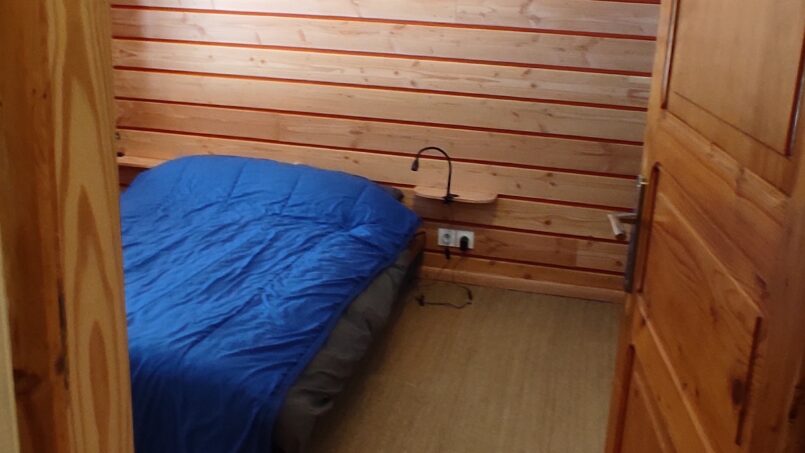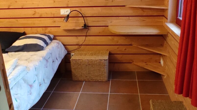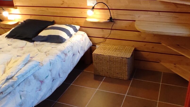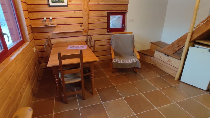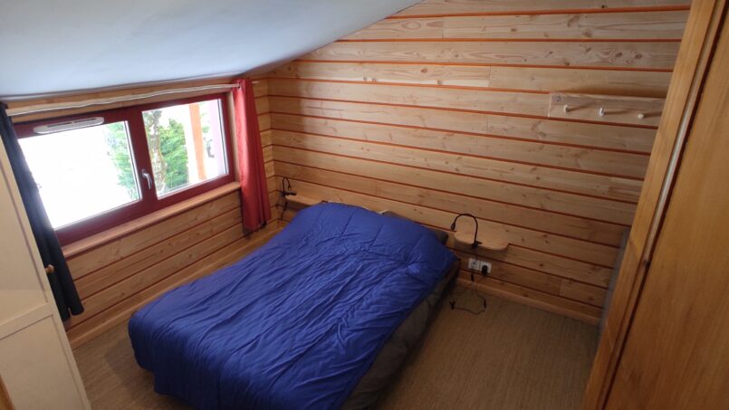 Ce chalet est composé d’un rez de chaussée (chambre, salle de bain et salon/cuisine) adapté pour des personnes à mobilité réduite et d’un étage pouvant être le lieu pour des amis ou de la famille. Une rampe d’accès et un sas d’entrée couvert en donne l’accès. Un espace extérieur est accessible autour du chalet.