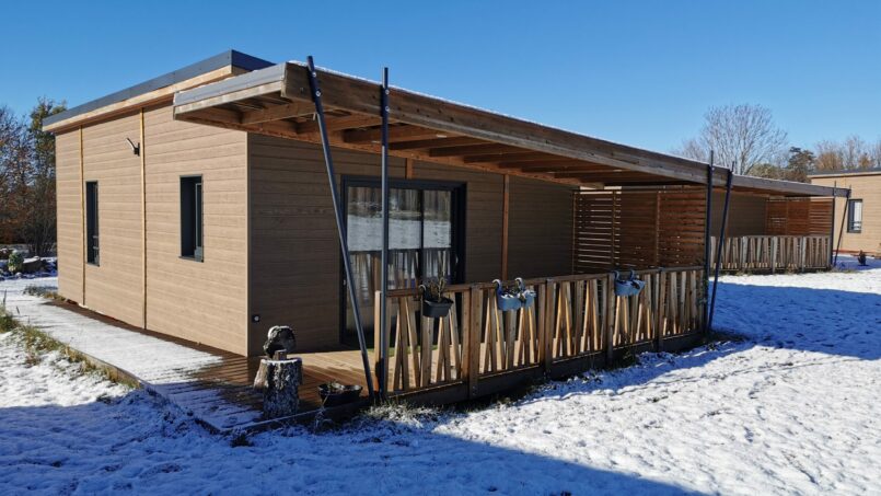 Commentaire : Chaque chalet est équipé d'une rampe qui mène au chalet plain-pied. L'entrée se fait par une baie vitrée de plus d'1m de large