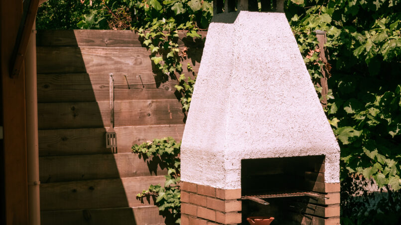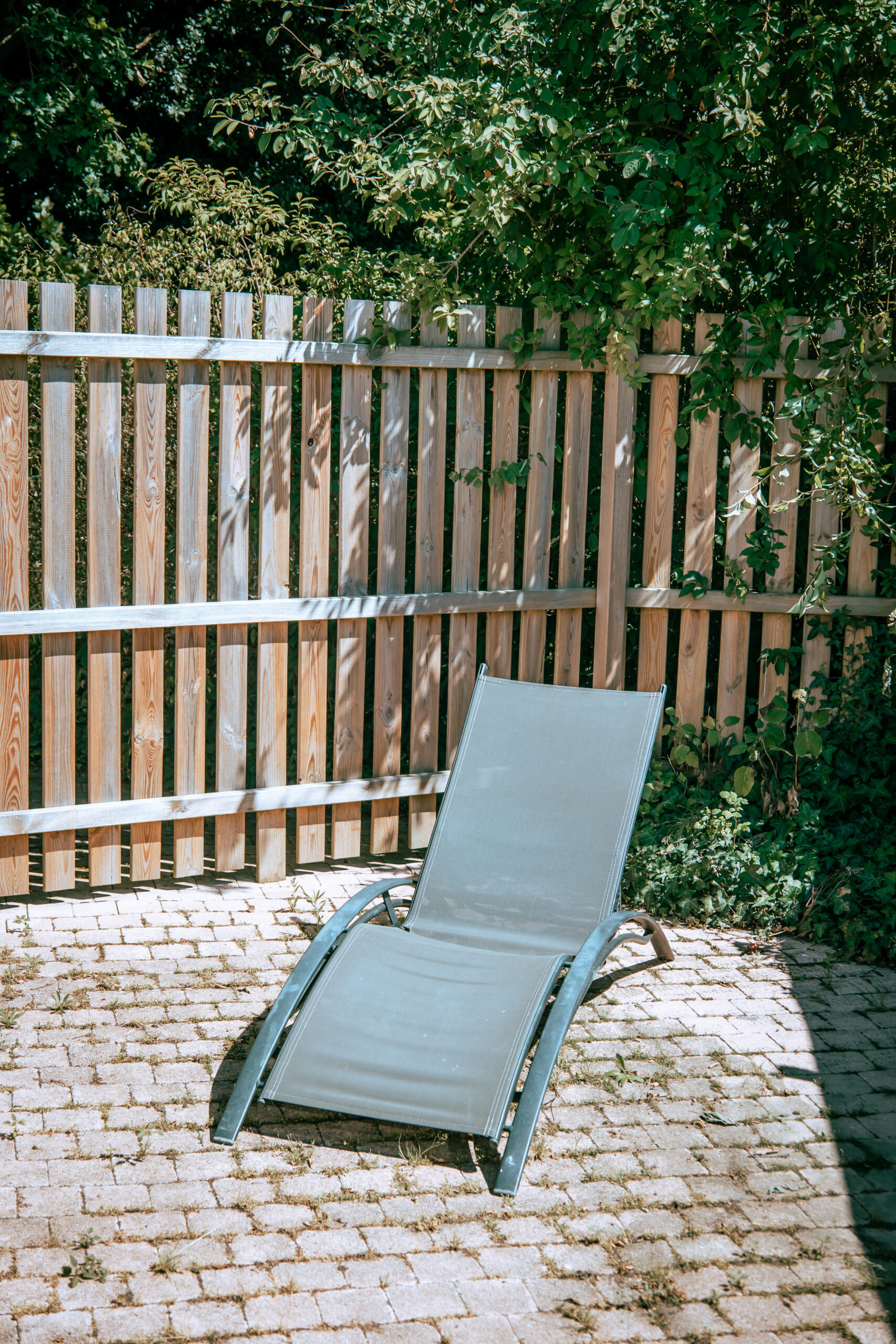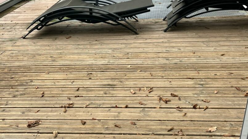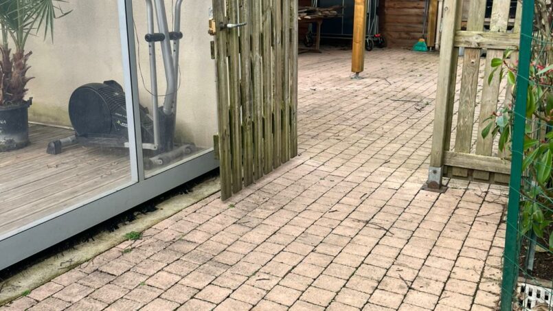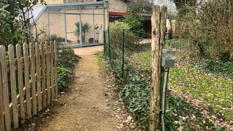 Grande terrasse donnant sur parc arboré avec terrain de pétanque, balançoires enfants.