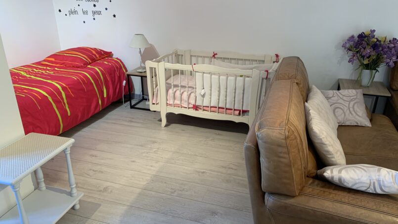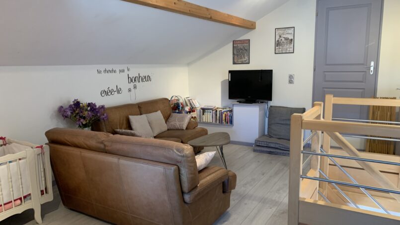 Au 1er étage par escalier : grande pièce de 36m² en mezzanine composée d’un coin détente avec canapés, télé, livres et jeux. Un lit 2 places et 1 lit d’une place séparés par un pare-vue, toilettes avec lavabo.