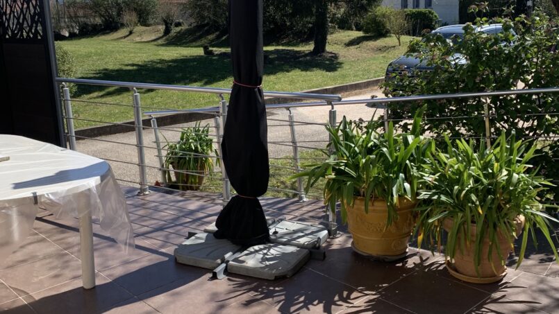 Grande terrasse de 40m² avec salon de jardin et chaises longues.