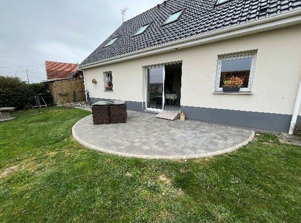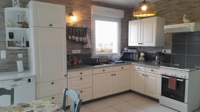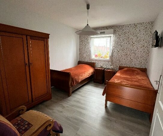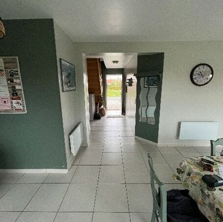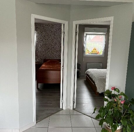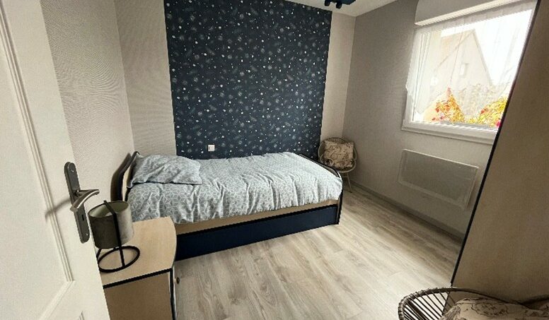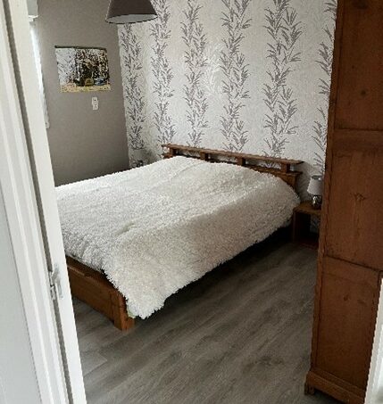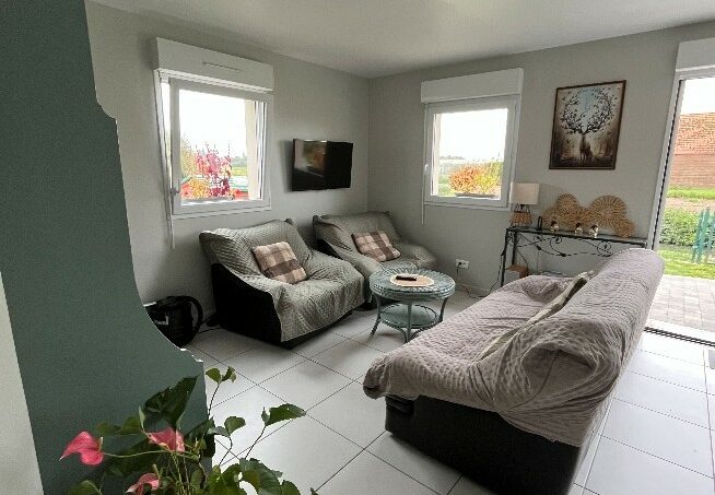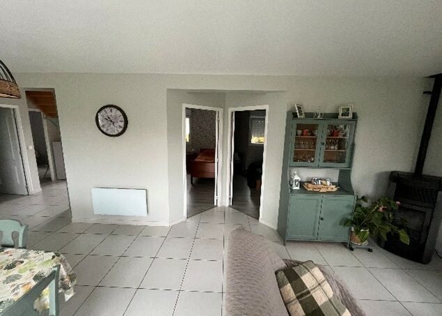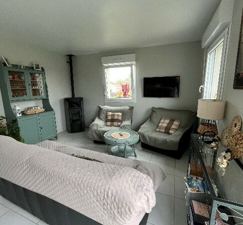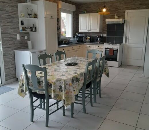 Maison neuve individuelle avec hall d’entrée, une cuisine américaine, toute équipée avec gazinière, four électrique, micro-ondes, lave-vaisselle, cafetière, bouilloire, grille-pain, autocuiseur, cuit vapeur, gaufrier, … ouvert sur un séjour et un salon avec poêle à bois, une salle de bain avec douche à l’italienne, lavabo et WC; un cellier avec MAL, un WC indépendant; une chambre avec 1 lit 2 pers (160 cm) ; 1 chambre avec 2 lits 1 pers (2 x 90 cm) , et une chambre enfant avec 1 lit 1 pers (90 cm), un lit bébé et tout l’équipement bébé