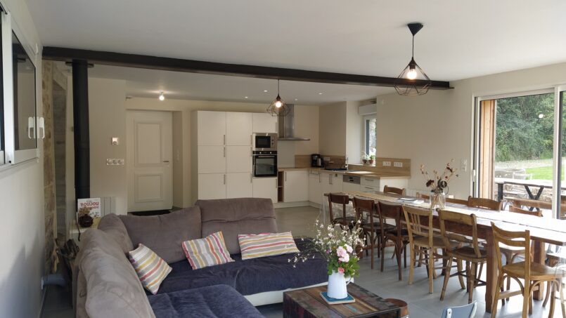 La pièce de vie, avec de vastes espaces de circulation, comprend une cuisine tout équipée, un espace repas avec grande table pouvant accueillir jusqu’à 14 personnes, un coin salon douillet avec canapé confortable et poêle à bois.