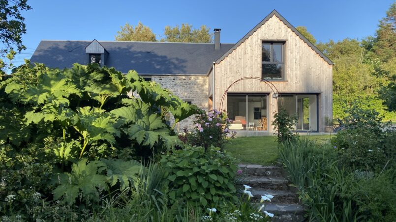 Grande terrasse, un jardin paysager de 1 500 m2, bordé d’un ruisseau.