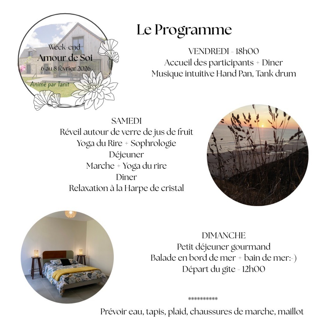 Pour le Week-end Spécial "Détente" du 6 au 8 février 2026, une tarification spéciale est appliquée, la maison étant partagée pour l'ensemble des participants. Ne tenez pas compte des tarifs qui s'affichent dans le pavé Réservations.