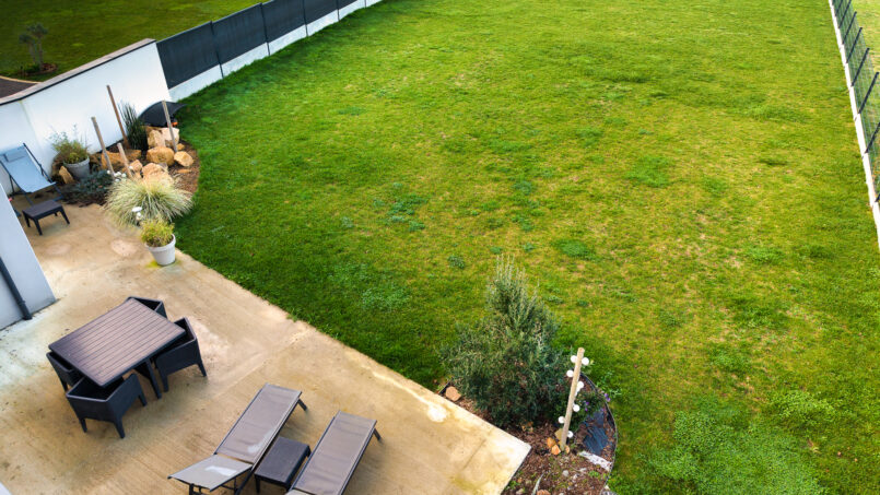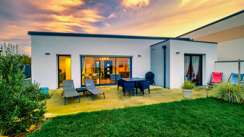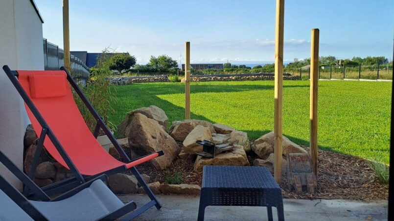 À l’extérieur, un grand jardin clos de 700 m² avec salon de jardin, barbecue, chaises longues, balançoire et vue dégagée sur la mer au loin.