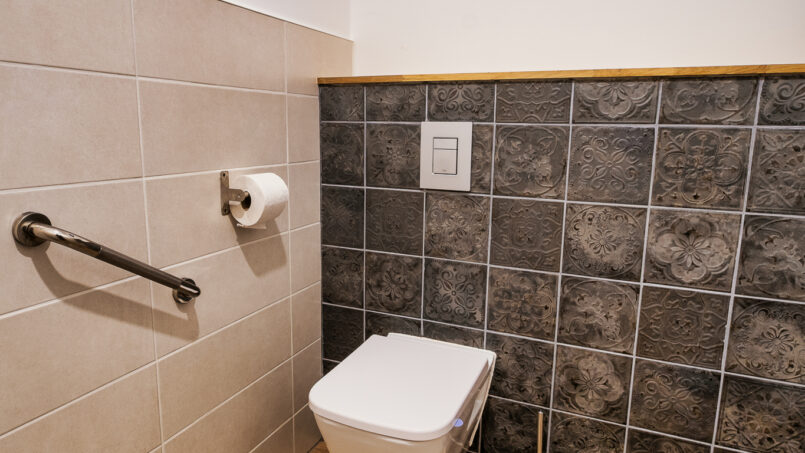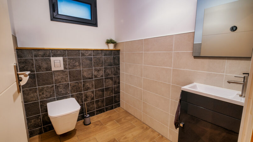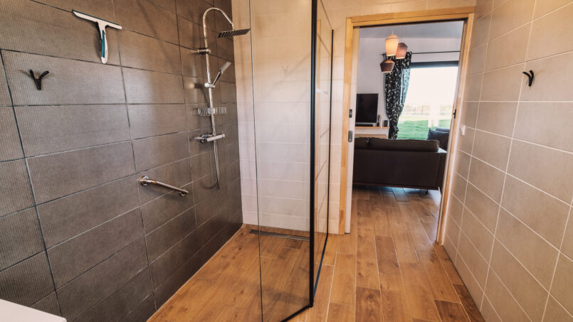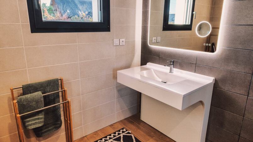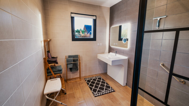– Salle d’eau avec douche à l’italienne, banc et meuble vasque adapté PMR