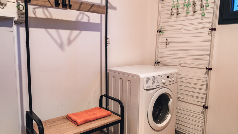 – Buanderie avec lave-linge, étendoir, fer et table à repasser