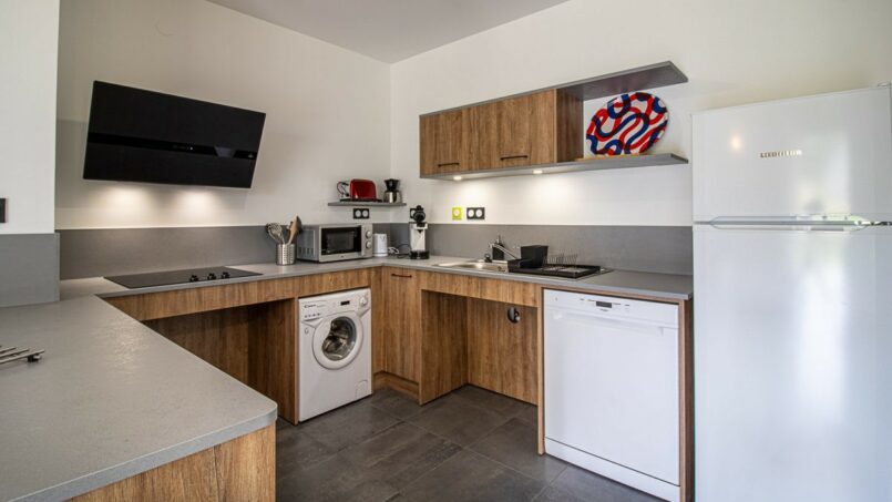 Gite de plain pied composé de : une pièce de vie avec salon, salle à manger et cuisine intégrée et équipée, une salle d’eau avec deux vasques, un wc indépendant, 2 chambres, une première avec 1 lit160x200 adapté PMR et une seconde avec 1 lit 160×200 modulable en 2 lits 80×200. Terrasse couverte avec salon de jardin et barbecue. Charges comprises.