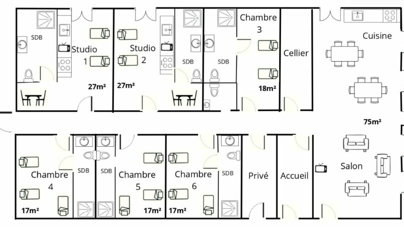 2 studios (entièrement équipés avec douche et sanitaires privatifs).