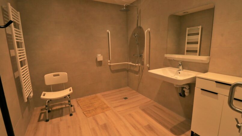 Le gîte a été entièrement conçu pour accueillir des personnes en fauteuil ou à mobilité réduite, grand salon, séjour, cuisine équipée, 2 grandes chambres accessibles PMR, salle d’eau et WC séparés. Parking adapté PMR – Vous avancez jusque sous la terrasse.