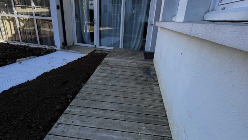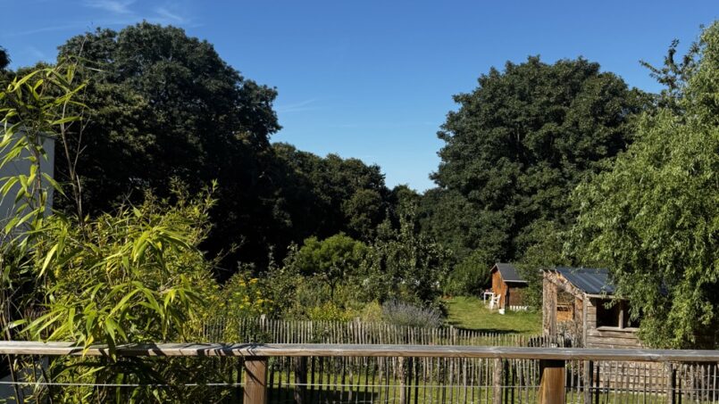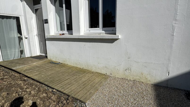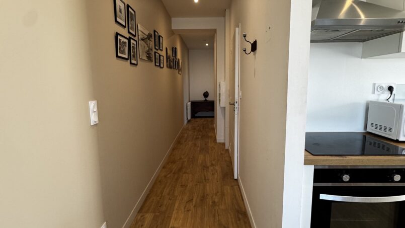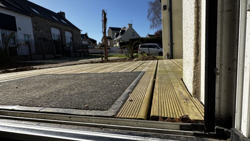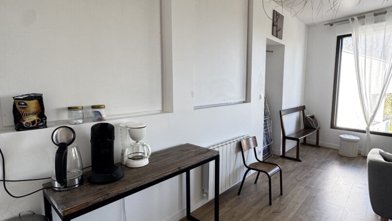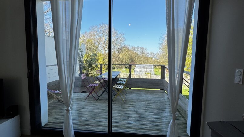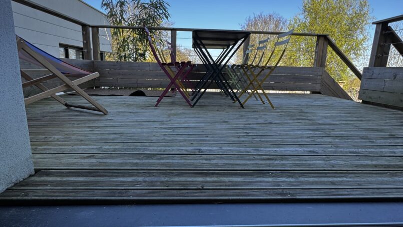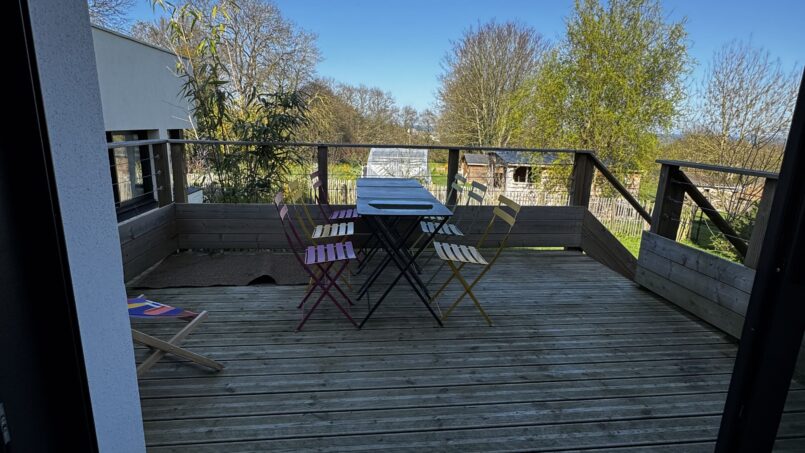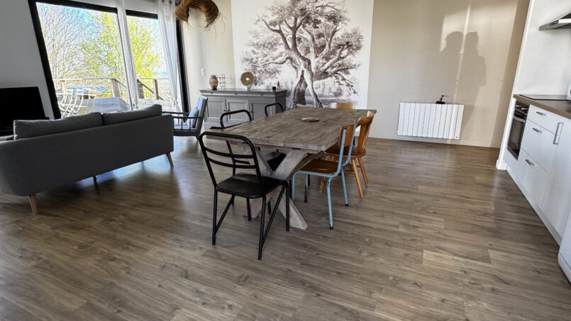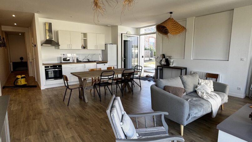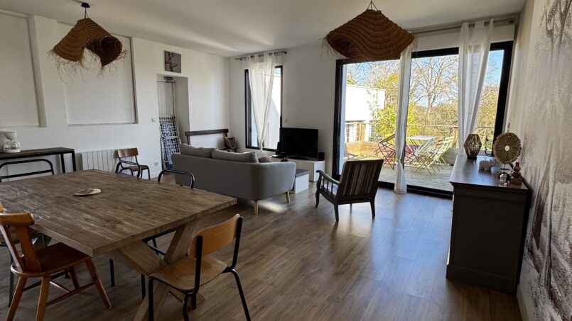 Belle pièce de vie avec cuisine, séjour, salon donnant sur une belle terrasse en bois,