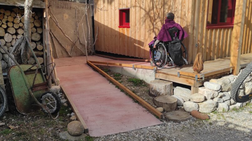 Un espace plat extérieur est accessible autour du chalet.