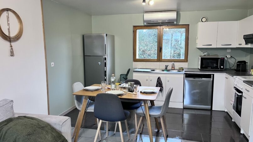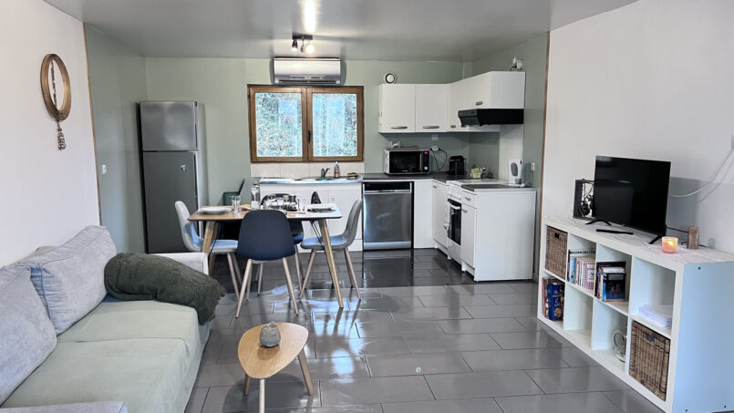 pièce à vivre, dont cuisine avec un canapé lit 2 couchages (décrit en espace de couchage 2 dans le pavé bleu ci-dessous)