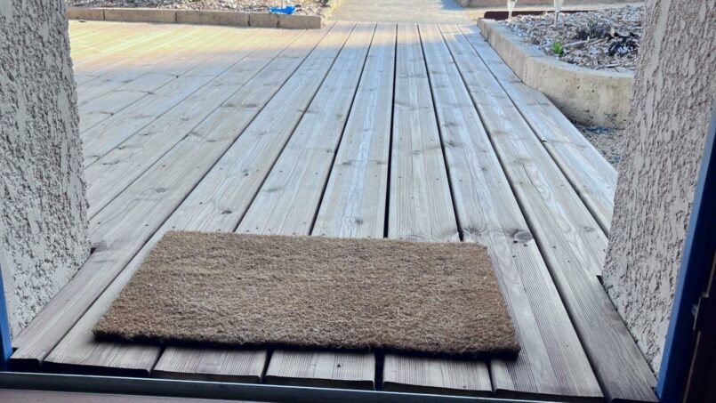 Dans le pavé bleu ci-dessous, l’entrée, la cuisine, la pièce à vivre, l’espace de couchage 1, la salle de bain, les WC et la terrasse décrites se trouvent dans le gîte PMR. L’espace de couchage 2 se trouve dans le second gîte, non PMR. Il s’agit du canapé lit dans la pièce à vivre. A noter que dans ce second gîte il n’y a pas de salle de bain au RDC et les toilettes du RDC ne sont pas PMR.