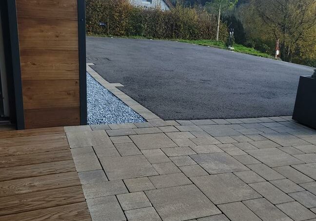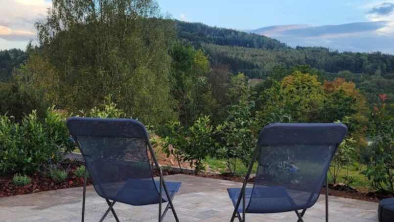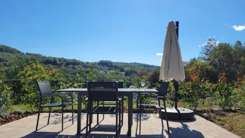 Jardin privatif avec coin repas, bain de soleil, patio, barbecue, grand parking privé, jeux d’enfants et abri de jardin.