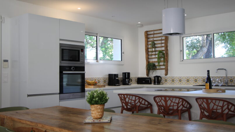 La maison est entièrement équipée, lave linge, sèche linge, lave-vaisselle, micro-onde, four à pyrolyse, plaque induction, 2 grands réfrigérateurs/congélateur, plancha inox ainsi que tout le petit matériel nécessaire à la vie courante (fer et table à repasser, produits ménager, aspirateur, trousse premiers secours, télé, lecteur de DVD/Blu-Ray…).