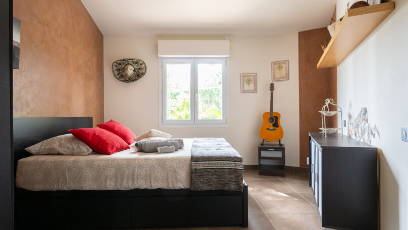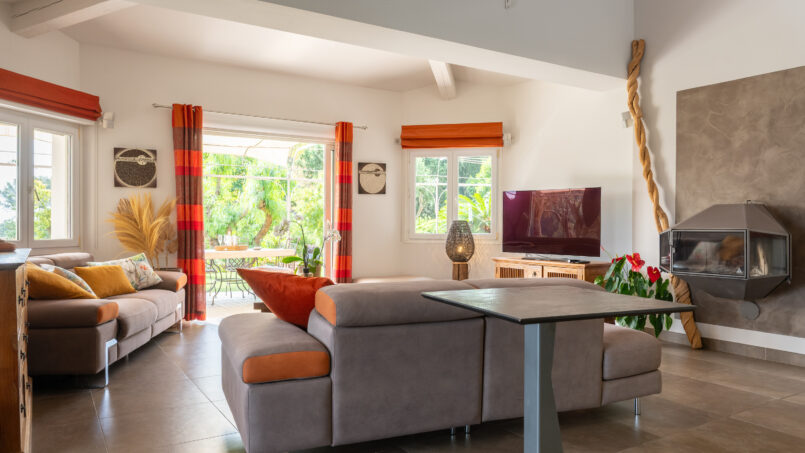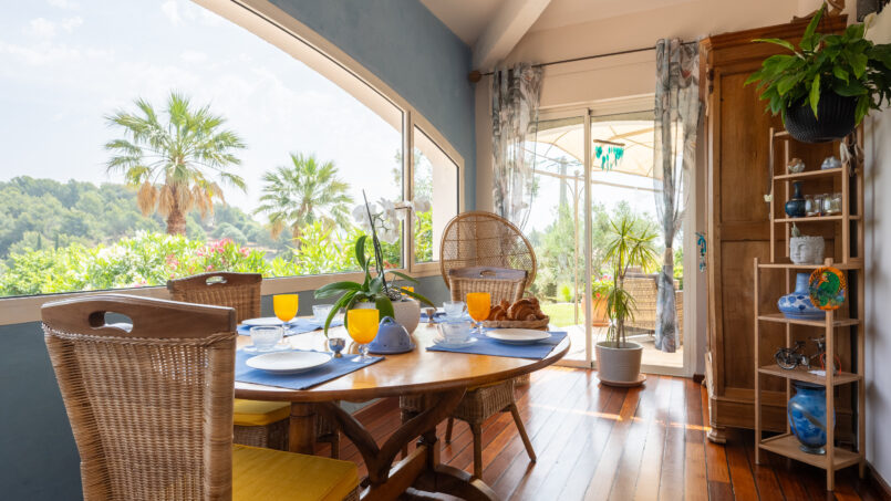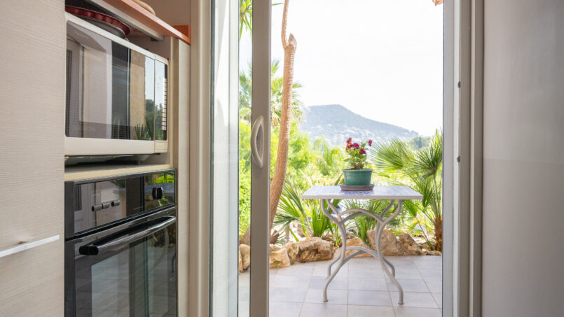 La cuisine attenante est totalement équipée et le coin repas est une pièce ouverte sur l’extérieur qui offre une vue sur la colline très appréciée.