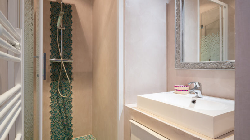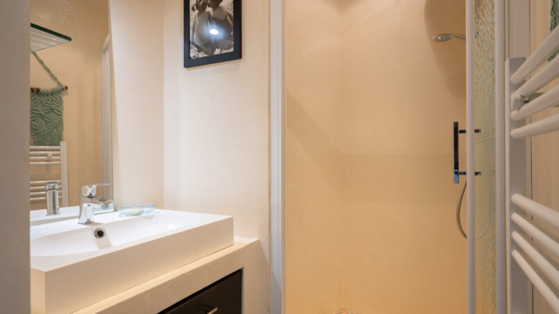 Trois chambres dont une avec sa salle de bains avec baignoire ,douche avec siège percé et WC.Les deux autres ont leurs douches et lavabos.