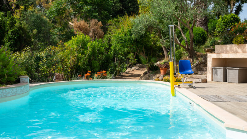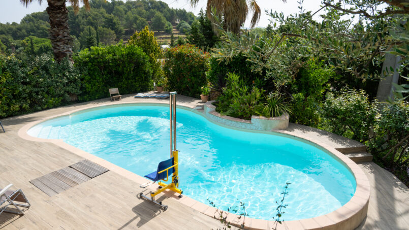 La piscine accessible par la cours ou par le jardin est équipée d’un siège hydraulique ,une douche et un WC accessibles.