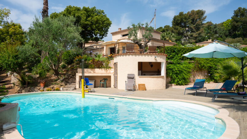 Elle est située dans un quartier calme , bénéficie d’une jolie vue dominante et d’une aperçue mer accessible à 5mn en voiture.