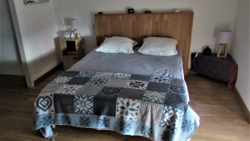 A l’étage : 2 chambres dont une avec balcon, 2 grands lits et 1 lit 1 place, salle de bains avec douche et wc.