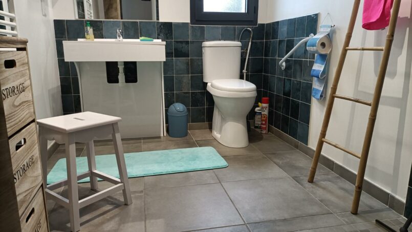 – salle de bain avec douche, WC rehaussé, lavabo conçu pour le passage du fauteuil roulant